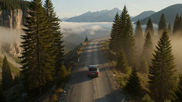 Aerial perspective, smooth tracking shot from above and behind, a lone car winds along a narrow mountain road, surrounded by towering pine trees and steep cliffs, morning mist rolling across the landscape. The road curves gracefully through the rugged terrain, with occasional glimpses of distant peaks and deep valleys. Ambient audio includes the soft hum of the engine, the subtle crunch of tires on gravel, distant bird calls, and the gentle whisper of wind through the trees. Natural soft lighting with early sunlight filtering through the mist. Cinematic style: serene and atmospheric, evoking a sense of solitude and quiet exploration.