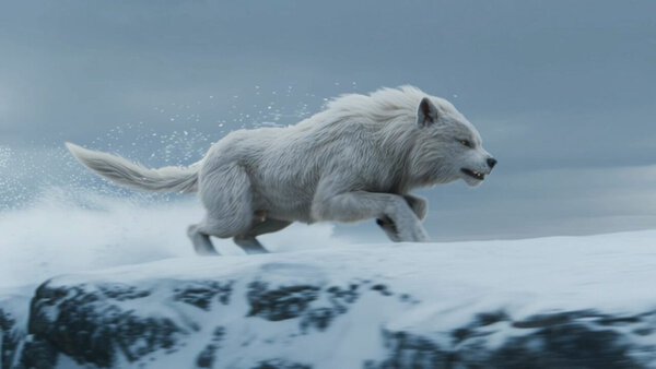 A colossal wolf creature sprints across a snowy ridge, camera orbiting it in a wide circular drift while snow blasts off its fur in ultra-detailed slow motion, icy mist rising with each breath, mountains trembling as it leaps over a chasm.