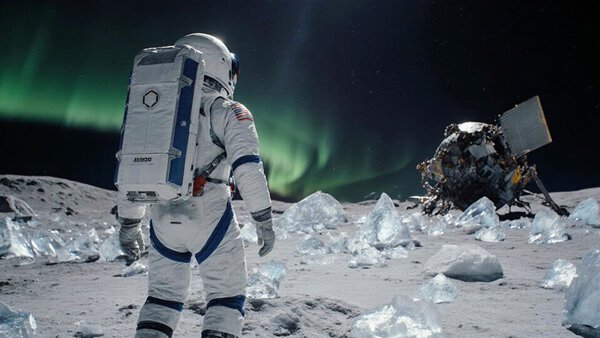 Wide-angle landscape shot, an explorer in an advanced EVA suit treks across the frozen surface of an alien moon, ice shards glint like glass, distant terrain shows a crashed satellite half-consumed by ice, soft green auroras dance across the sky — a lonely, beautiful moment of sci-fi isolation.